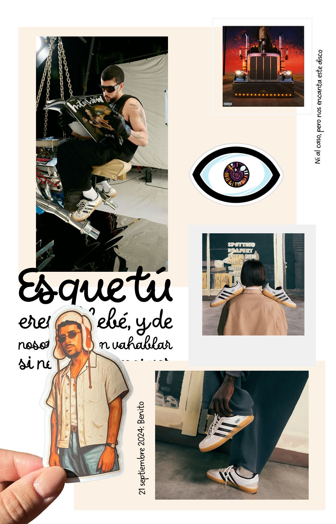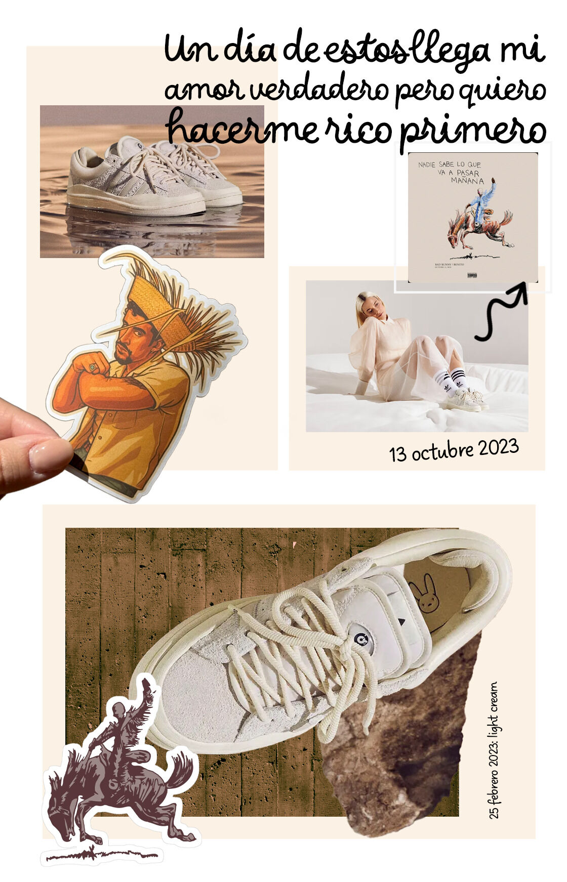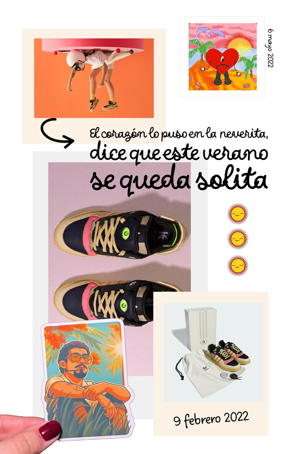 Y es justo aquí donde entra su mancuerna con adidas: una alianza creativa que inició en 2021 y que redefinió por completo cómo puede verse, sentirse y venderse una collab entre un artista global y una marca deportiva. Bajo el lema “Las cosas cambian”, Bad Bunny y adidas han reinterpretado siluetas clásicas como el Forum, Campus y Response CL con una mezcla única de diseño chunky, paletas de color cargadas de personalidad, materiales premium y storytelling que conecta directamente con la cultura latina. Cada lanzamiento ha sido un evento gigantesco, no solo por el hype, sino por el enfoque conceptual que Benito imprime en cada par: infancia, nostalgia, libertad creativa y hasta guiños a su vida cotidiana.