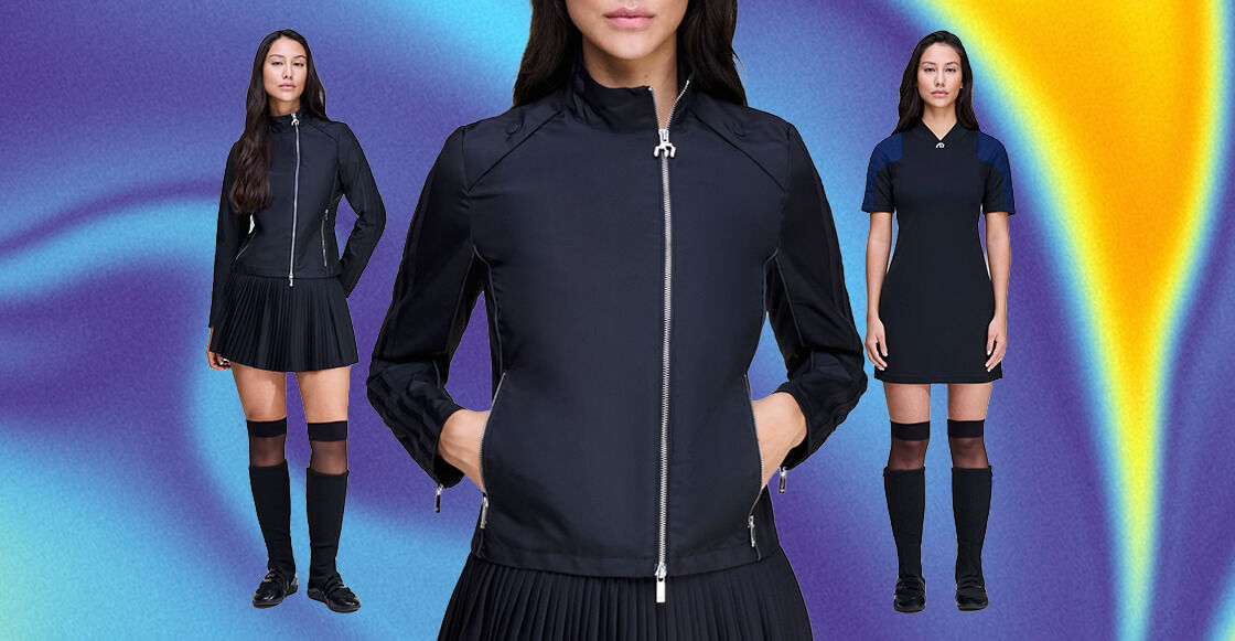 Una chamarra de lona en negro tipo corsé y un vestido negro tejido con corte clásico.
