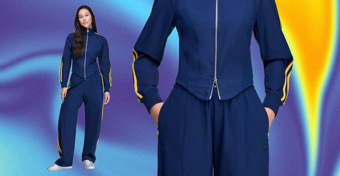 Para el apparel, un set deportivo compuesto por pantalones, chamarra y playera con la misma paleta: azul marino, amarillo y blanco.