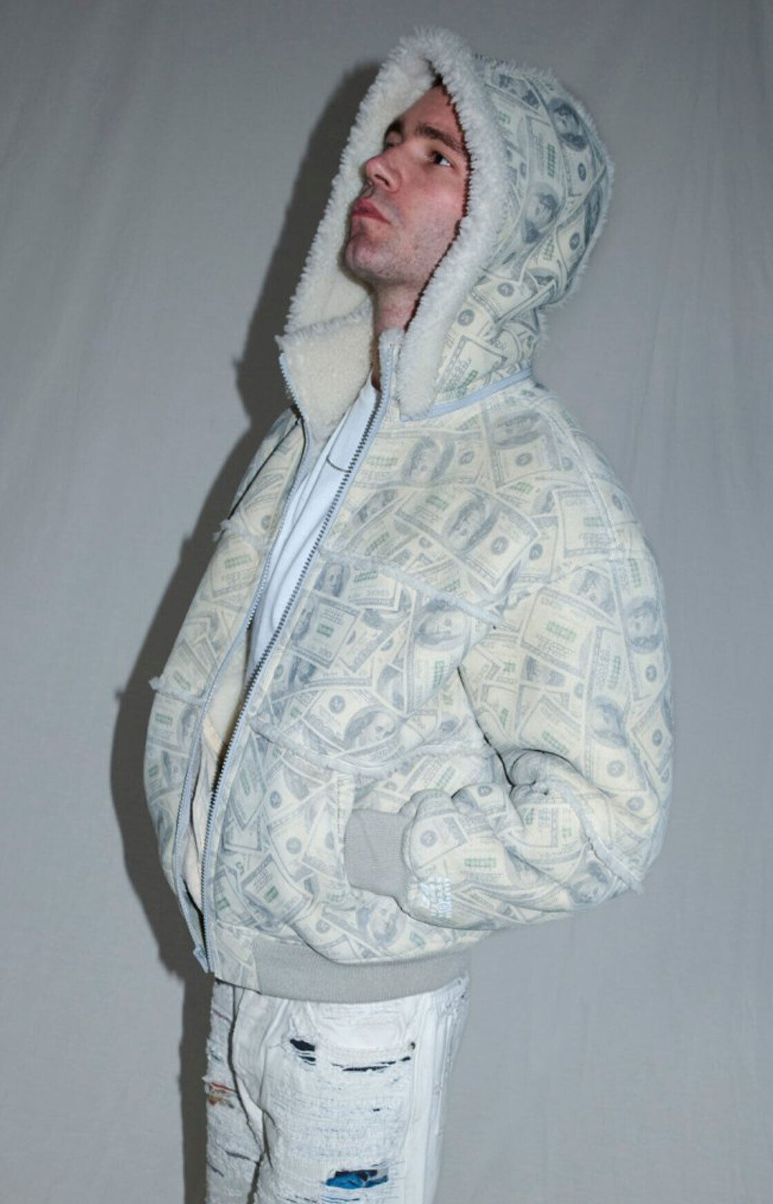 Una chamarra oversize con forro de lana y el print estrella: billetes de 100 dólares. Si lo tuyo no es el flashing, también está en un colorway morado; en ambas versiones puedes quitar la capucha.