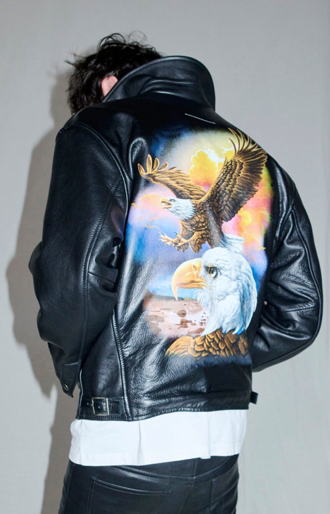 Una chamarra de cuero que inevitablemente recuerda a Sons of Anarchy: piel negra, silueta oversized y un águila en la espalda como pintada a mano.