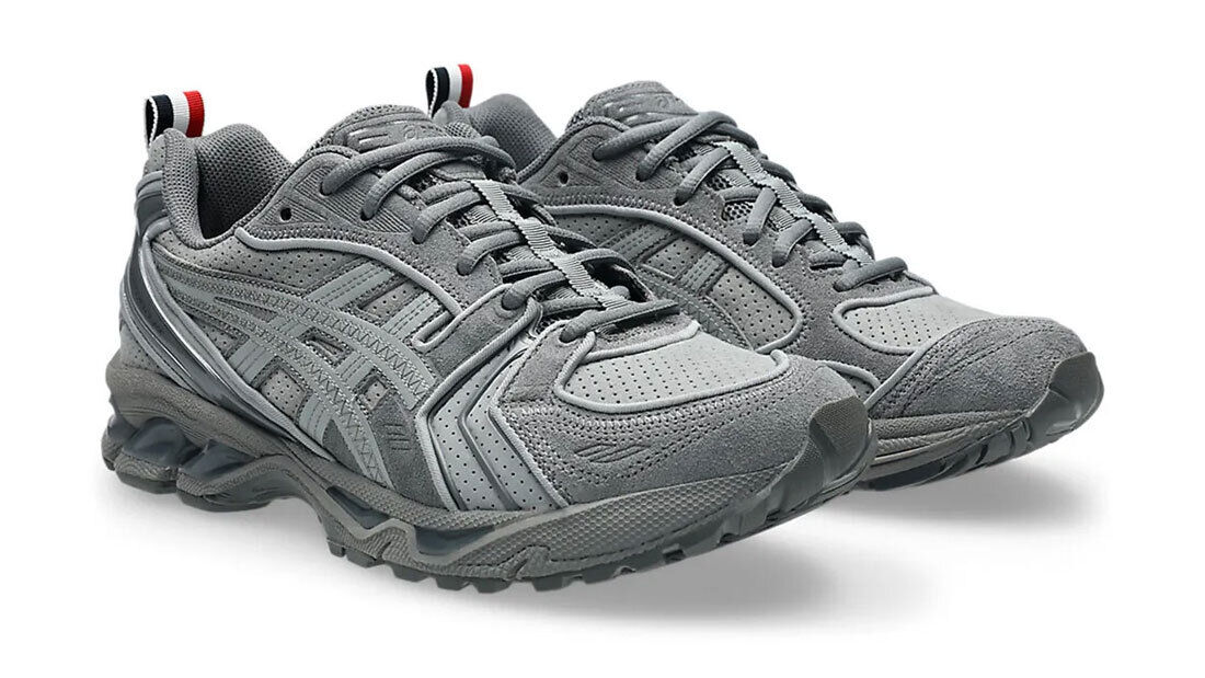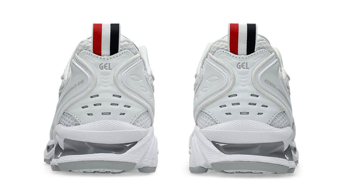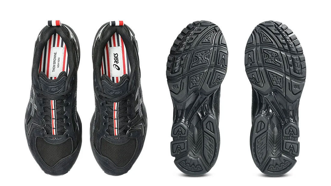 El negro y el gris se inclinan por el ante, mientras que el blanco se inclina por el cuero y la malla. El logotipo de rayas rojas, blancas y azules de Thom Browne aparece brevemente en el three pack, concretamente en las tiras de la lengüeta, el cuello del talón y las plantillas.