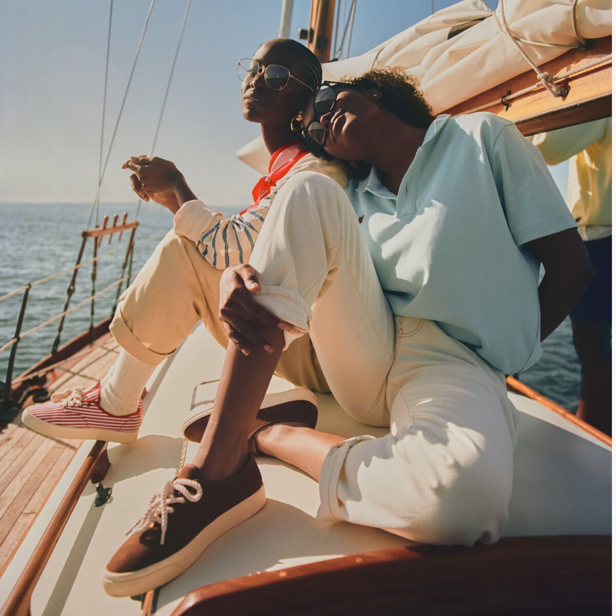 Entre los modelos revitalizados, el Naut-1, originalmente concebido como un calzado náutico liviano, se reinventa con una mezcla de lona y gamuza, agujetas de cuerda y ojales metálicos. Se presenta en dos versiones de gamuza felpuda en azul y café sólidos, y dos versiones de lona con rayas rojas o azul claro, todas manteniendo el espíritu marítimo original.