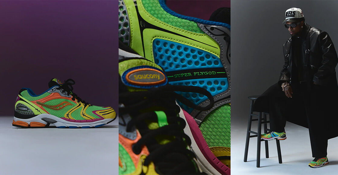 La silueta elegida es el campeón del año un ProGrid Triumph 4 que ha visto, la ejecución es una muestra de Ego Trip más clásico: verde fluorescente para establecer una visión clara, acentuada con toques de rosa, amarillo, naranja y azul. El logo del escorpión de Griselda Records se encuentra en las plantillas rojas, mientras que "Super Flygod" recorre la parte media. Incluye un empaque especial con el sello "My Saucony's Glowin", junto con una etiqueta colgante naranja de Griselda.